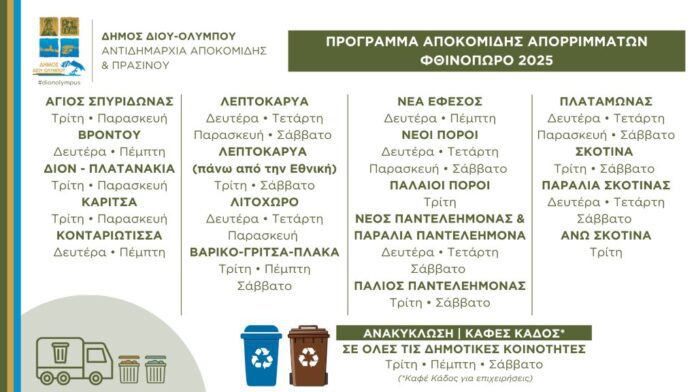 Από την Αντιδημαρχία Αποκομιδής & Πρασίνου του Δήμου Δίου-Ολύμπου ανακοινώνεται ότι το φθινοπωρινό πρόγραμμα αποκομιδής απορριμμάτων στις δώδεκα κοινότητες του Δήμου διαμορφώνεται ως εξής: