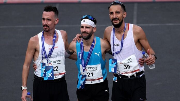 Σε μια συγκινητική στιγμή ο Παναγιώτης Καραΐσκος περίμενε μετά τον τερματισμό του και αγκάλιασε έναν-έναν τους συναθλητές του όταν έκοβαν το νήμα.