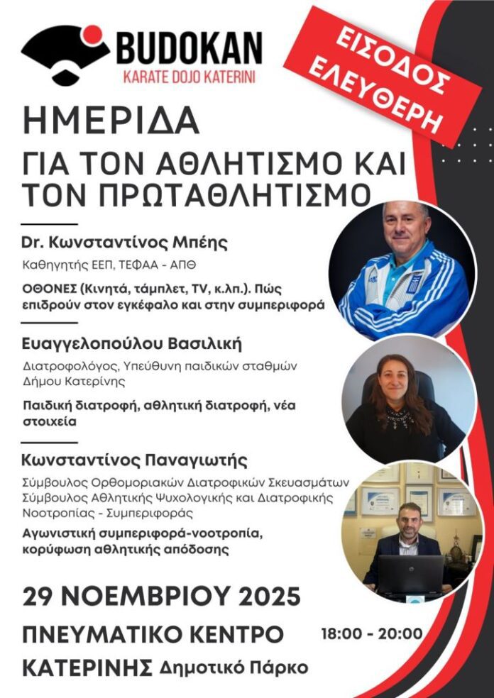 «Αθλητισμός και Πρωταθλητισμός» είναι το θέμα ημερίδας που διοργανώνει το Budokan Karate Dojo Κατερίνης, το Σάββατο 29 Νοεμβρίου 2025, (18:00 – 20:00), στο Συνεδριακό Κέντρο του Δημοτικού Πάρκου Κατερίνης (7ης Μεραρχίας).