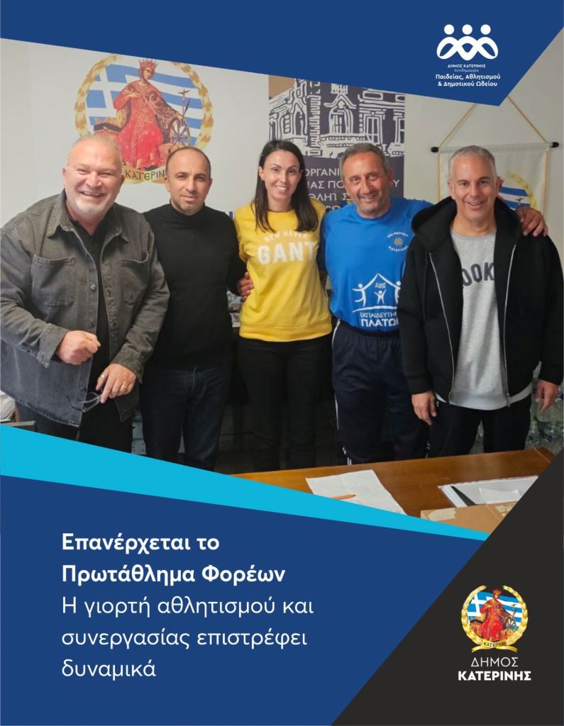 Μετά από χρόνια απουσίας, το Πρωτάθλημα Φορέων επιστρέφει δυναμικά στα αθλητικά δρώμενα της Κατερίνης.  Ο Δήμος, μέσω της Αντιδημαρχίας Αθλητισμού, Παιδείας & Δημοτικού Ωδείου/Τμήμα Αθλητικής Ανάπτυξης, δίνει ξανά ζωή σε έναν θεσμό που προάγει τον συναγωνισμό, τον αθλητισμό και τη συνεργασία ανάμεσα στους τοπικούς φορείς.