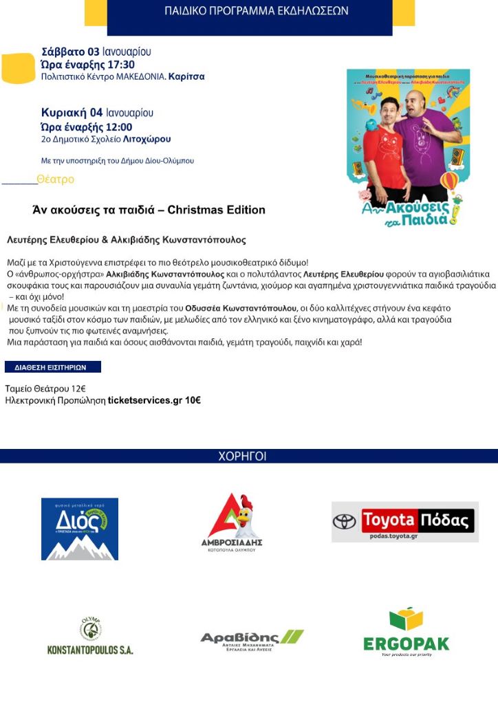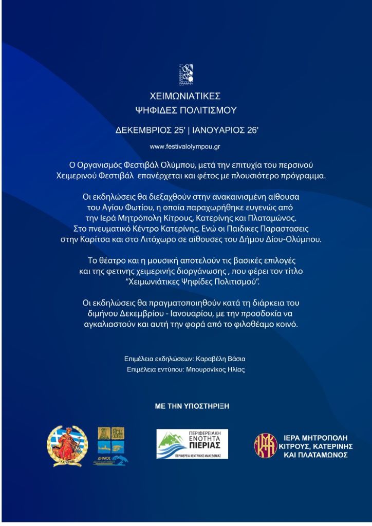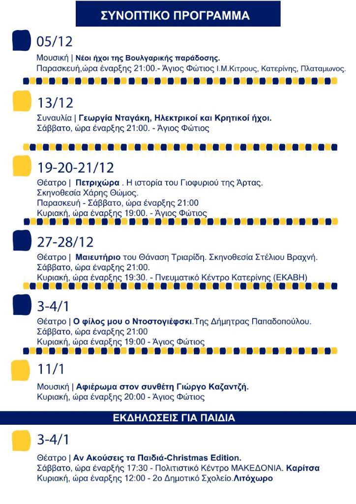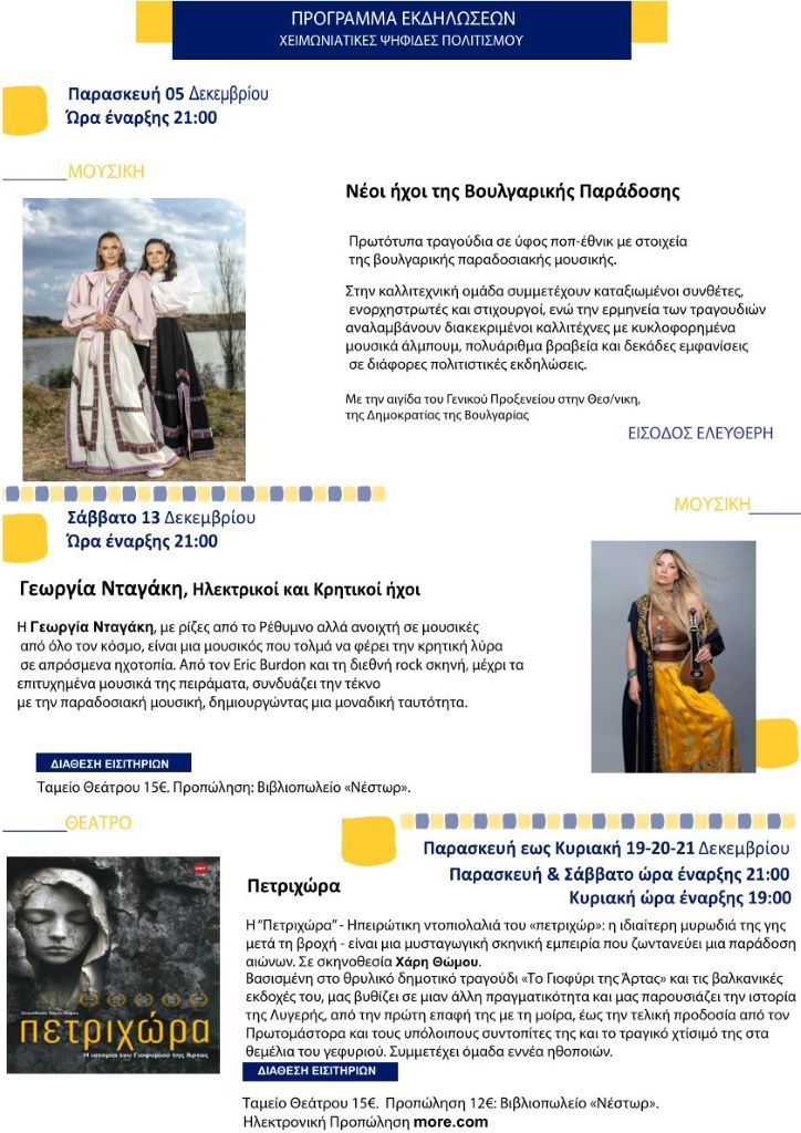Επισυνάπτεται το πρόγραμμα των εκδηλώσεων που θα υλοποιηθούν το δίμηνο Δεκέμβριος 2025-Ιανουάριος 2026 με παραστάσεις θεάτρου και μουσικής.