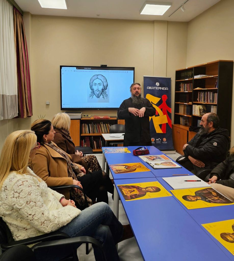 Συγκεκριμένα ο π. Θεόδωρος Κουστιάνης αφού μετέφερε τις ευλογίες του Σεβασμιωτάτου Μητροπολίτη Κίτρους, Κατερίνης & Πλαταμώνος κ.Γεωργίου, εξέφρασε ευχαριστίες προς τον Δήμο Κατερίνης και την αντιδημαρχία Πολιτισμού για τη συνεργασία στο πλαίσιο του Θεσμού των Αικατερινείων και τόνισε ότι «Η αγιογραφία είναι η ιερή τέχνη της απεικόνισης αγίων, σκηνών από τη Βίβλο και μορφών της Ορθόδοξης πίστης». Παράλληλα, αναφέρθηκε στην ιστορική εξέλιξη, σε υλικά και τεχνικές αλλά και στη Θεολογική διάσταση της αγιογραφίας υπογραμμίζοντας χαρακτηριστικά: «[..]Η αγιογραφία δεν είναι απλώς τέχνη, αλλά πράξη προσευχής».