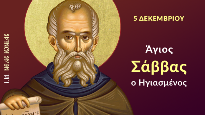 Ο Άγιος Σάββας καταγόταν από το χωριό Μουταλάσκη της Καππαδοκίας και ήταν γιος ευσεβών γονέων, του Ιωάννη και της Σοφίας. Από πολύ νωρίς γνώρισε τις θείες βουλές και αποφάσισε να αφιερωθεί στο μοναστικό βίο. Είχε τόση πίστη που κάποτε μπήκε σε ένα κλίβανο πυρός από τον οποίο βγήκε αβλαβής με τη βοήθεια του Θεού.