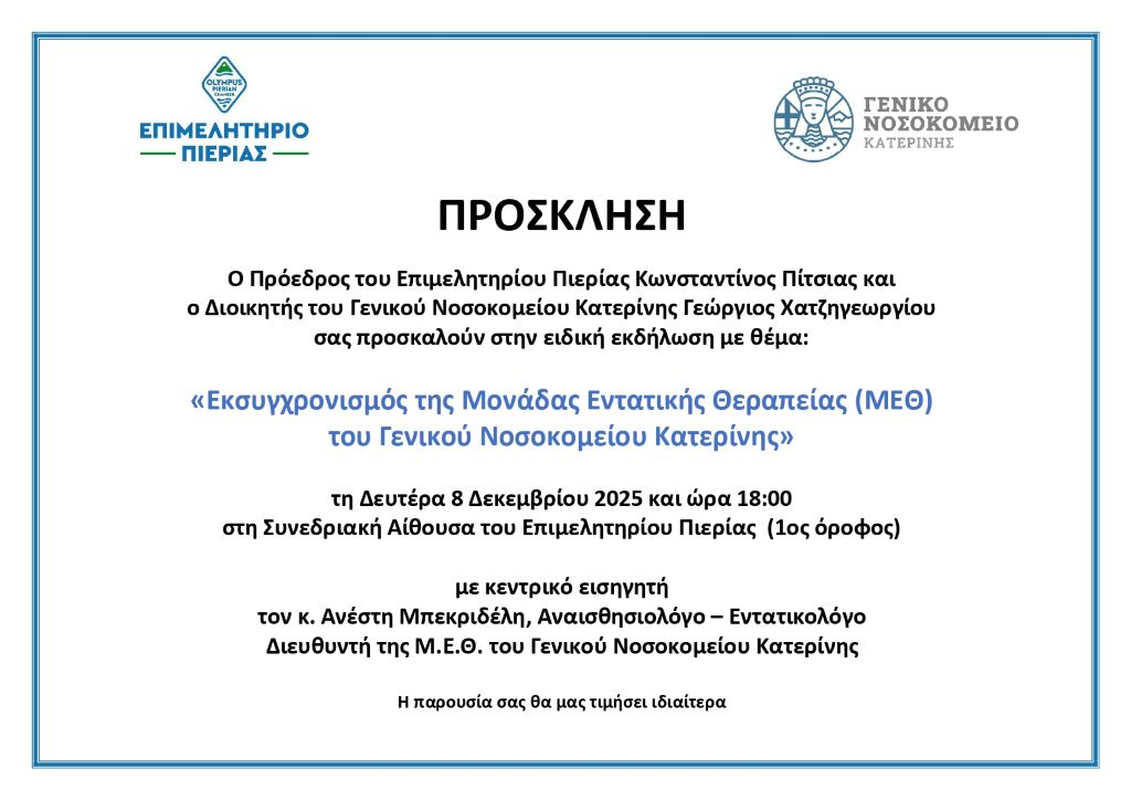 Επιμελητήριο Πιερίας: Ειδική εκδήλωση με θέμα: «Εκσυγχρονισμός της Μονάδας Εντατικής Θεραπείας (ΜΕΘ) του Γενικού Νοσοκομείου Κατερίνης»