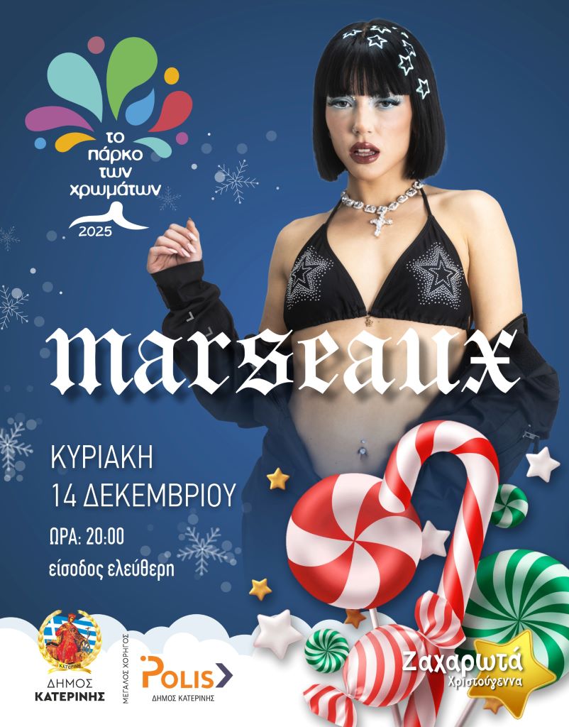 Η εκρηκτική pop star Marseaux έρχεται την Κυριακή 14 Δεκεμβρίου, στις 20:00, στο Πάρκο των Χρωμάτων, για μια βραδιά γεμάτη ρυθμό, συναίσθημα και… επόμενα hits! Στη σκηνή θα παρουσιάσει όλες τις αγαπημένες επιτυχίες και τα viral singles της, μαζί με τις πολυσυζητημένες συνεργασίες της με Έλενα Παπαρίζου, Stavento, Snik και Evangelia, μεταξύ άλλων.