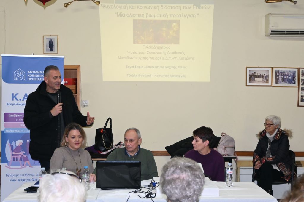 Κεντρικός ομιλητής ήταν ο Ψυχίατρος και Συντονιστής, Διευθυντής Μονάδων Ψυχικής Υγείας Πε.Δ.Υ.ΨΥ Κατερίνης, Δημήτριος Ξυλάς, ο οποίος ανέλυσε το φαινόμενο της λεγόμενης «μελαγχολίας των εορτών» και παρουσίασε τρόπους ενίσχυσης της ψυχικής ανθεκτικότητας και της κοινωνικής σύνδεσης. Μαζί του, η Κοινωνική Λειτουργός Βασιλική Τζιτζιλή και η Επισκέπτρια Ψυχικής Υγείας Σοφία Ζανιά προσέγγισαν θέματα συναισθηματικής ενδυνάμωσης και υγιούς διαχείρισης των εορταστικών ημερών μέσα από βιωματικές παρατηρήσεις και παραδείγματα της επαγγελματικής τους εμπειρίας.