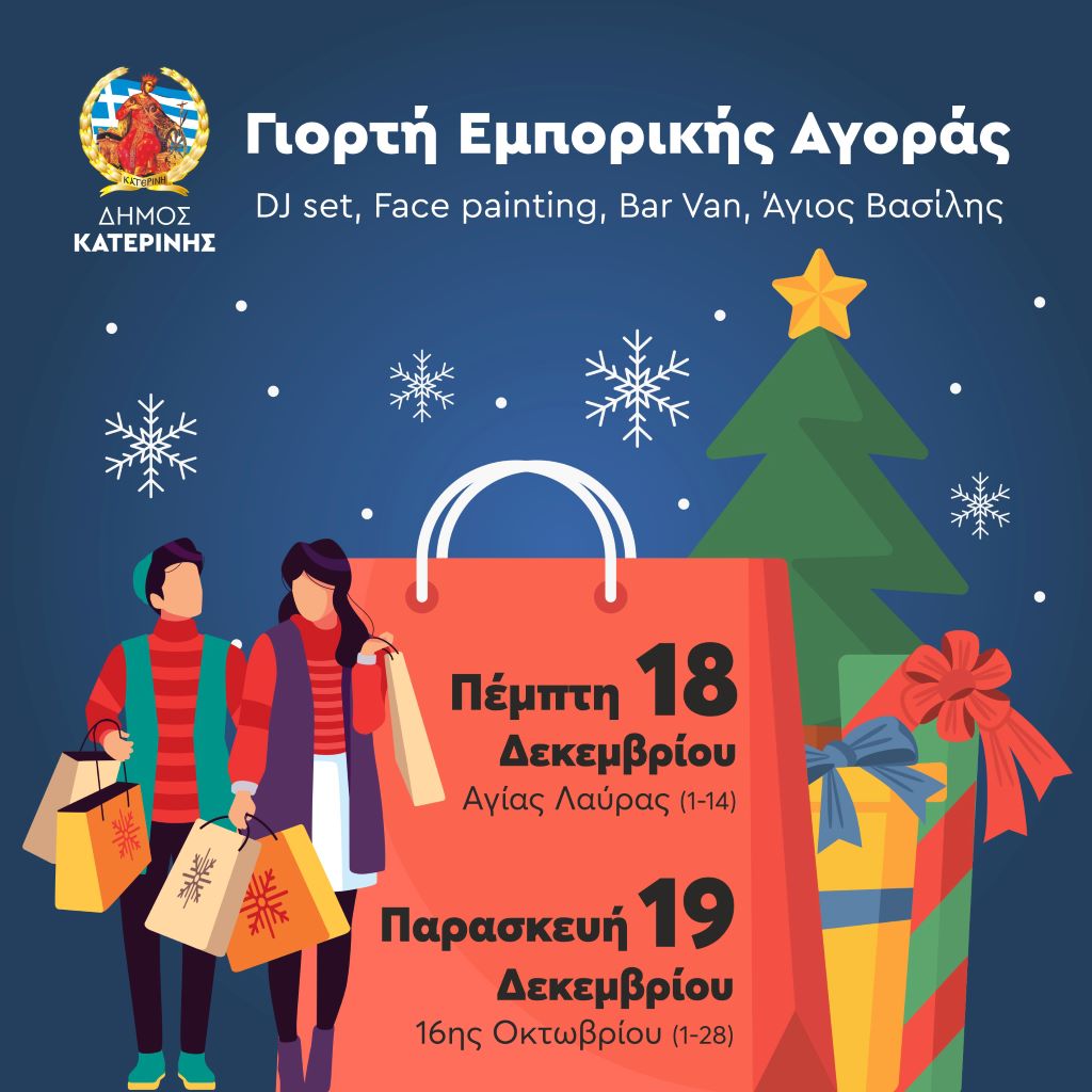 Φέτος, τα Χριστούγεννα αποκτούν νέο ρυθμό στους εμπορικούς δρόμους της Κατερίνης. Με πρωτοβουλία του Δήμου Κατερίνης/Αντιδημαρχία Τοπικής & Οικονομικής Ανάπτυξης, εγκαινιάζεται η «Γιορτή Εμπορικής Αγοράς», μια δράση που φέρνει τη μουσική, το φως και τη ζεστασιά των γιορτών εκεί όπου χτυπά η καρδιά της πόλης: στην αγορά της.