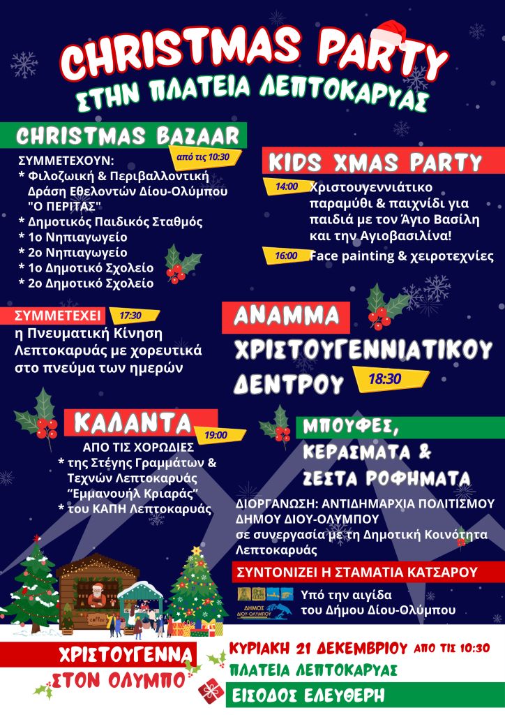 Σας προσκαλούμε στις εκδηλώσεις του Δήμου Δίου-Ολύμπου στις πρωτεύουσες των τριών δημοτικών ενοτήτων, Κονταριώτισσα, Λεπτοκαρυά και Λιτόχωρο, για να γιορτάσουμε παρέα και φέτος τα Χριστούγεννα, μουσικά και παραμυθένια.