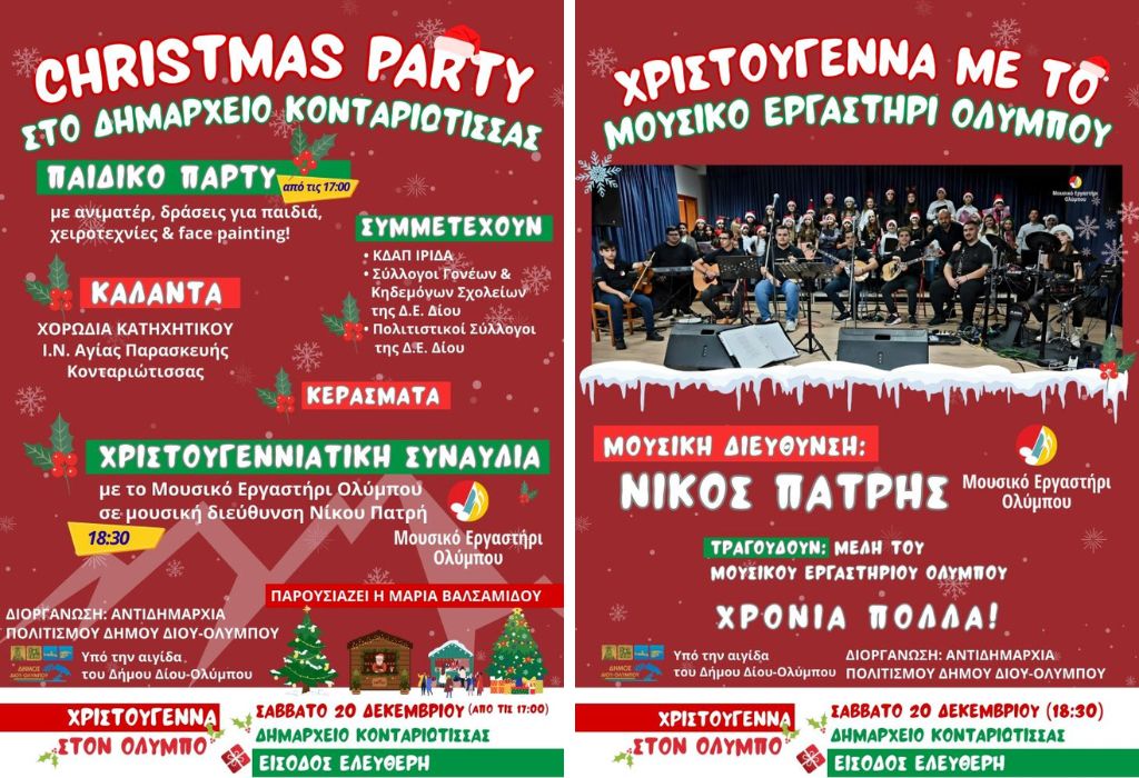 Σας προσκαλούμε στις εκδηλώσεις του Δήμου Δίου-Ολύμπου στις πρωτεύουσες των τριών δημοτικών ενοτήτων, Κονταριώτισσα, Λεπτοκαρυά και Λιτόχωρο, για να γιορτάσουμε παρέα και φέτος τα Χριστούγεννα, μουσικά και παραμυθένια.