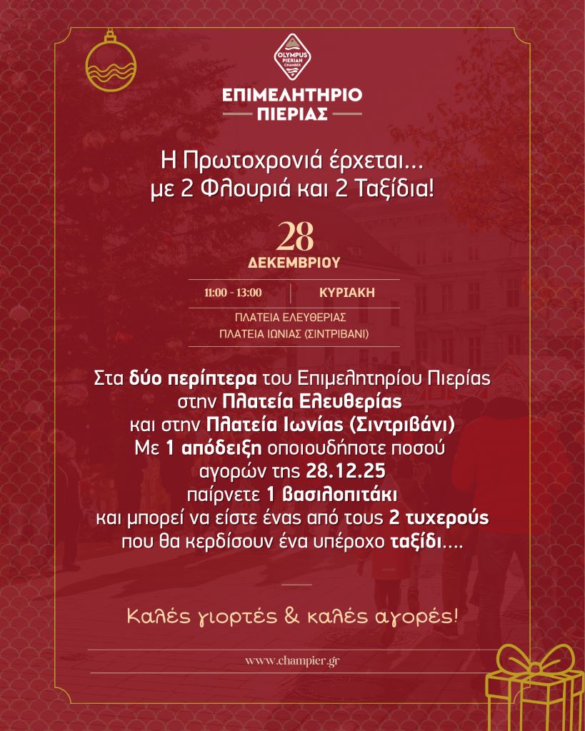 Το Επιμελητήριο Πιερίας διοργανώνει εορταστική δράση, την Κυριακή 28 Δεκεμβρίου 2025, από τις 11:00 έως τις 15:00, στον κεντρικό πεζόδρομο της οδού Μ. Αλεξάνδρου στην Κατερίνη.