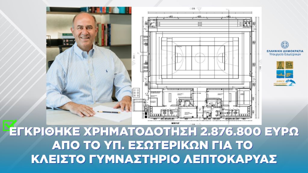 Με το ποσό των 2.876.800 ευρώ χρηματοδοτήθηκε ο Δήμος Δίου-Ολύμπου από το υπουργείο Εσωτερικών για την κατασκευή του κλειστού γυμναστηρίου Λεπτοκαρυάς. Η χρηματοδότηση δόθηκε με απόφαση του υπουργού Εσωτερικών, Θοδωρού Λιβάνιου.