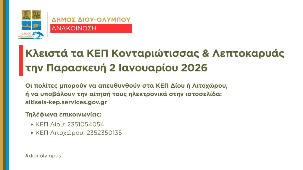 Δήμος Δίου-Ολύμπου: Κλειστά θα παραμείνουν τα ΚΕΠ Κονταριώτισσας και Λεπτοκαρυάς την Παρασκευή 2 Ιανουαρίου 2026