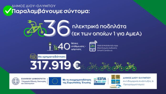 Τριάντα έξι κοινόχρηστα ηλεκτρικά ποδήλατα και σημεία φόρτισης θα αποκτήσει ο Δήμος Δίου-Ολύμπου προϋπολογισμού 317.919 ευρώ