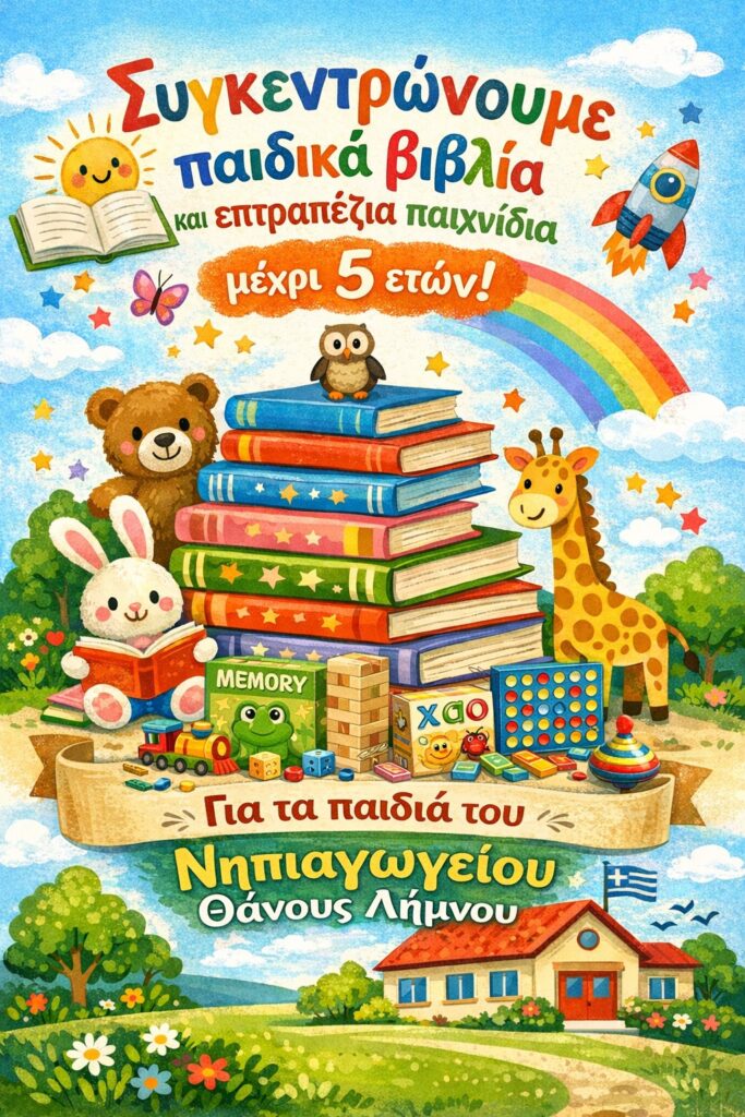 Συγκεντρώνουμε παιδικά βιβλία, παραμύθια και επιτραπέζια παιχνίδια για παιδιά έως 5 ετών, τα οποία θα δοθούν δωρεά στο Νηπιαγωγείο Θάνους Λήμνου.