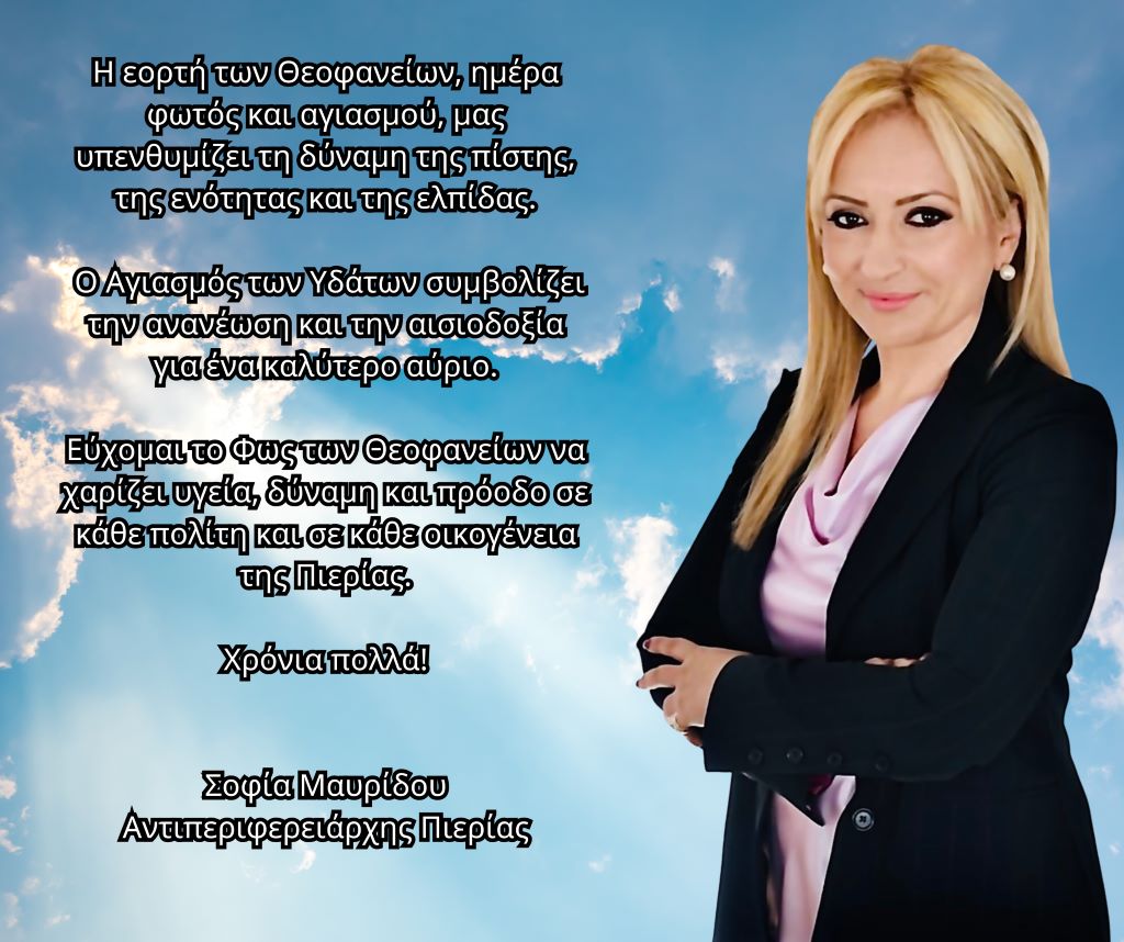 Εύχομαι από καρδιάς το Φως των Θεοφανείων να φωτίζει τις ζωές όλων, να χαρίζει υγεία, δύναμη και προκοπή σε κάθε οικογένεια και να αποτελεί πηγή ελπίδας και δημιουργίας για τον τόπο μας.