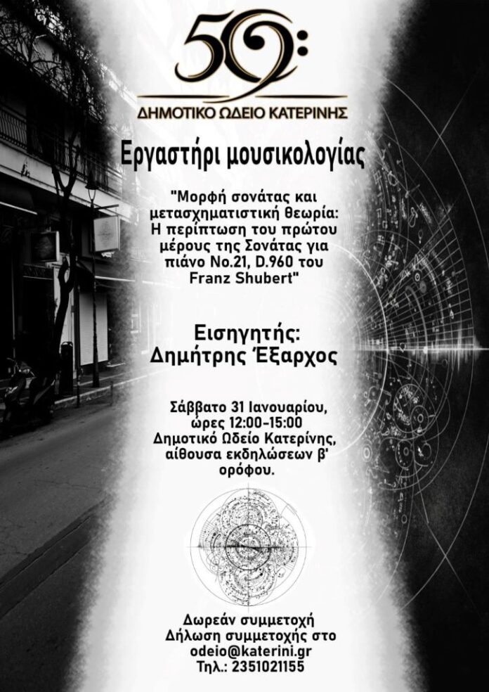 Στο πλαίσιο των εορταστικών εκδηλώσεων για τα 50 χρόνια προσφοράς του Δημοτικού Ωδείου Κατερίνης, το Σάββατο 31 Ιανουαρίου, ώρες 12:00 έως 15:00, θα πραγματοποιηθεί στο Δημοτικό Ωδείο Κατερίνης (αίθουσα β’ ορόφου) δωρεάν εργαστήρι μουσικολογίας από τον επίκουρο καθηγητή Μουσικολογίας του Πανεπιστημίου Ιωαννίνων, Δημήτρη Έξαρχο.