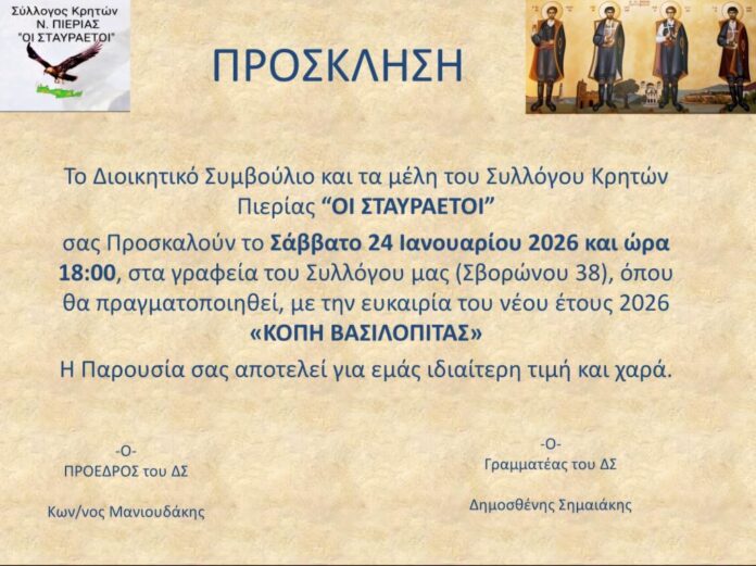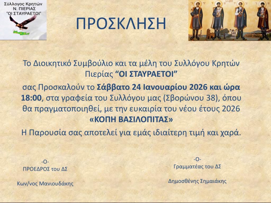 Με ιδιαίτερη Τιμή και Χαρά σας προσκαλούμε να παρευρεθείτε στην ΚΟΠΗ ΒΑΣΙΛΟΠΙΤΑΣ με την ευκαιρία του ΝΕΟΥ ΕΤΟΥΣ 2026, στα γραφεία του Συλλόγου, το ερχόμενο Σάββατο 24 Ιανουαρίου 2026 και ώρα 18:00.