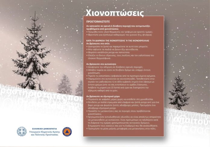 Συνιστούμε την προσοχή στους δημότες μας να είναι προσεκτικοί. Οι οδηγίες Πολιτικής Προστασίας για την προετοιμασία σε περίπτωση χιονόπτωσης και παγετού αναφέρουν: