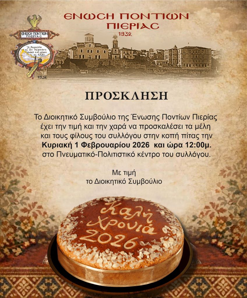 Το Διοικητικό Συμβούλιο της Ένωσης Ποντίων Πιερίας έχει την τιμή και την χαρά να προσκαλέσει τα μέλη και τους φίλους του συλλόγου στην κοπή πίτας την