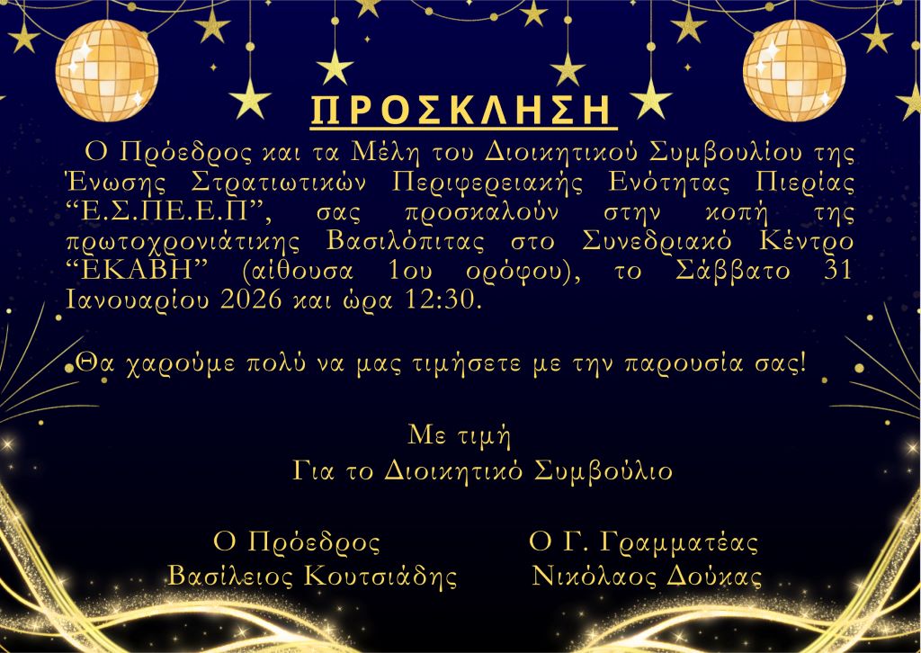 Ένωση Στρατιωτικών Περιφερειακής Ενότητας Πιερίας – Πρόσκληση για κοπή βασιλόπιτας