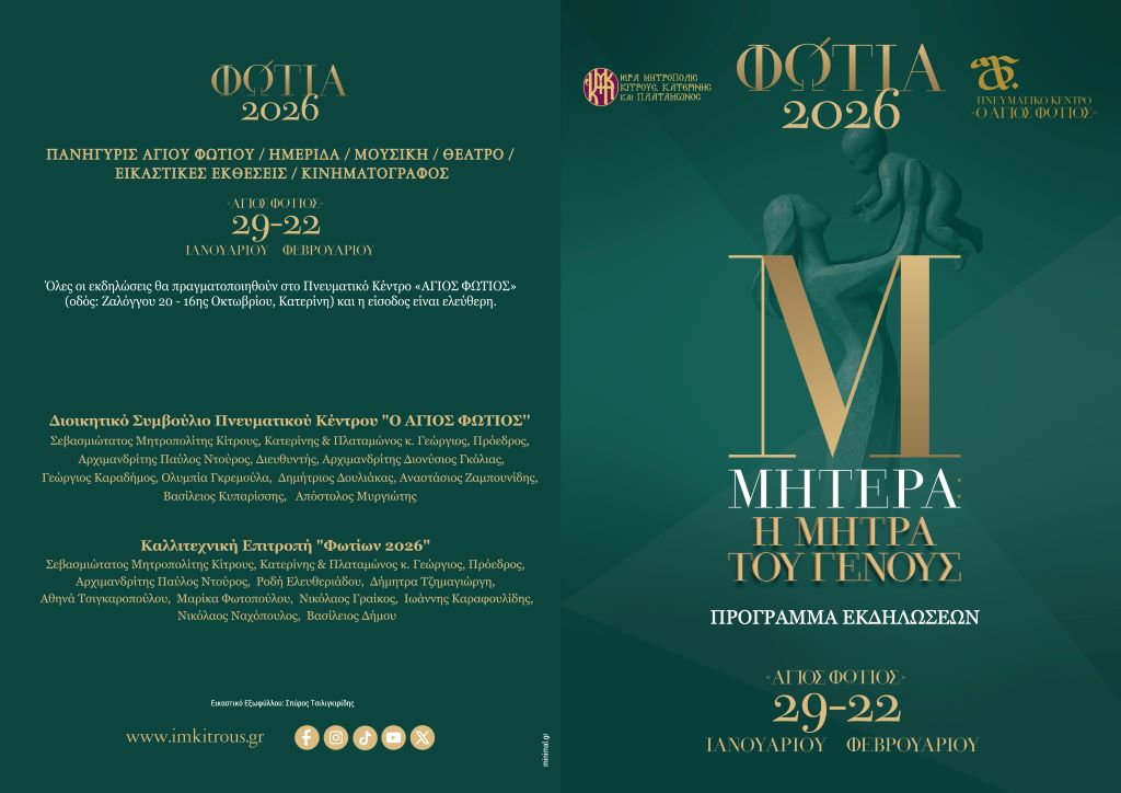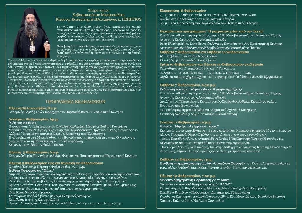 Η Ιερά Μητρόπολη Κίτρους, Κατερίνης και Πλαταμώνος διοργανώνει και φέτος τον καθιερωμένο πολιτιστικό και πνευματικό θεσμό «Φώτια», έναν θεσμό που αποτελεί διαχρονικό σημείο αναφοράς για την πνευματική και πολιτιστική ζωή της τοπικής κοινωνίας, ενισχύοντας τη σύνδεση της Εκκλησίας με τον πολιτισμό και τη νέα γενιά.