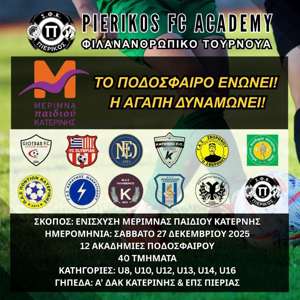 Η Μέριμνα Παιδιού Κατερίνης θα ήθελε να εκφράσει τις θερμότερες ευχαριστίες προς τον ΣΦΚ Πιερικός 1961 για τη διοργάνωσης του φιλανθρωπικού αγώνα και τη γενναιόδωρη προσφορά των εσόδων (915,70ευρώ) που συγκεντρώθηκαν προς τον Σύλλογό μας.