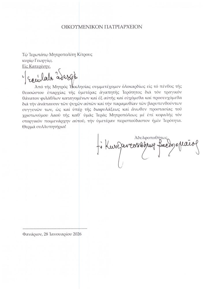 Συλλυπητήριο τηλεγράφημα του Οικουμενικού Πατριάρχη προς τον Μητροπολίτη Κίτρους για το τραγικό δυστύχημα των νέων φιλάθλων