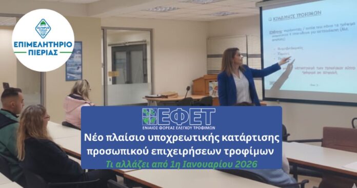 Το Επιμελητήριο Πιερίας ενημερώνει τα μέλη του και κάθε ενδιαφερόμενη επιχείρηση του κλάδου των τροφίμων και της εστίασης για τις ριζικές αλλαγές που επιφέρει η νέα νομοθεσία (Υ.Α. 110581/2025) στην υποχρεωτική κατάρτιση του προσωπικού (Επίπεδο 1).