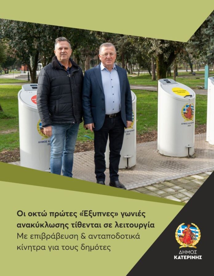 Σε ένα καθοριστικό βήμα στον στόχο για διαλογή των ανακυκλώσιμων απορριμμάτων στην πηγή προχωρά ο Δήμος Κατερίνης. Ο λόγος για τις οκτώ πρώτες «έξυπνες» γωνιές ανακύκλωσης, οι οποίες στο πλαίσιο του προγράμματος «Αντώνης Τρίτσης», τέθηκαν σήμερα σε λειτουργία, ενώ σταδιακά θα αρχίσουν να παραδίδονται προς χρήση και άλλες οκτώ που έχουν τοποθετηθεί ήδη, σε ισάριθμες περιοχές. «Μια νέα εποχή στη διαχείριση απορριμμάτων για την πόλη μας ξεκίνησε. Εργαζόμαστε για μια Κατερίνη πιο βιώσιμη, πιο καθαρή, πιο πράσινη. Σε ειδικά διαμορφωμένους χώρους, στις γωνιές ανακύκλωσης πραγματοποιούμε ανακύκλωση με το σύστημα της διαλογής στην πηγή, δηλαδή με διαχωρισμό των ανακυκλώσιμων υλικών και εναπόθεσή τους σε χωριστούς κάδους τεσσάρων διαφορετικών ρευμάτων αποβλήτων» σημείωσε ο Δήμαρχος, Ιωάννης Ντούμος.