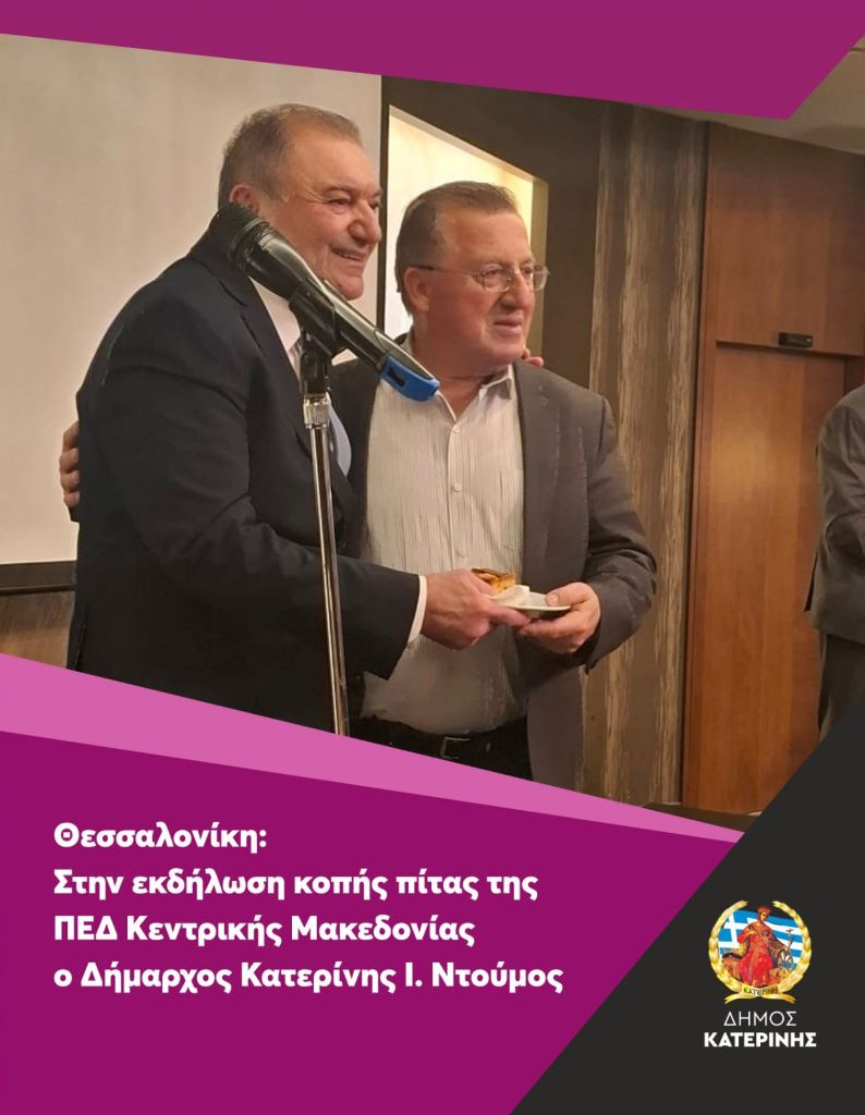 Στην καθιερωμένη ετήσια εκδήλωση κοπής της βασιλόπιτας της Περιφερειακής Ένωσης Δήμων (ΠΕΔ) Κεντρικής Μακεδονίας, στη Θεσσαλονίκη, μία μεγάλη γιορτή της τοπικής αυτοδιοίκησης, συμμετείχε χτες το απόγευμα, ως μέλος του Δ.Σ., ο Δήμαρχος Κατερίνης, Ιωάννης Ντούμος, ο οποίος αντάλλαξε απόψεις με συναδέλφους του, για ζητήματα τρέχουσας επικαιρότητας που απασχολούν την αυτοδιοίκηση. Επίσης, εγκάρδιες ευχές για το 2026. «Με ενότητα, ευθύνη και πνεύμα συνεργασίας όλοι μαζί οι δήμαρχοι μπορούμε να αντιμετωπίσουμε τις σύγχρονες προκλήσεις και να προχωρήσουμε στο θεσμικό εκσυγχρονισμό της τοπικής αυτοδιοίκησης» σημείωσε σε δήλωσή του ο κος Ντούμος.