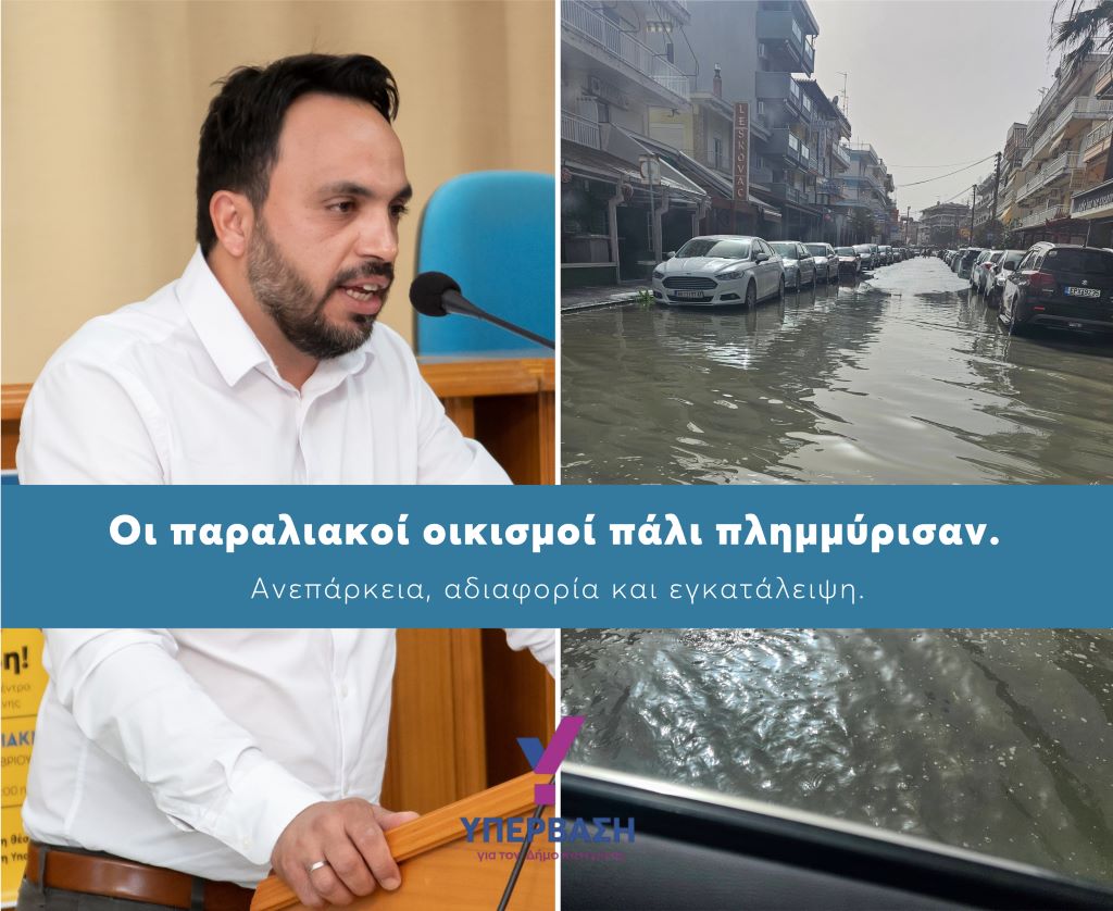 Δεν είναι η πρώτη φορά που πλημμυρίζει η Παραλία και η Κατερινόσκαλα. Κι αν το 2022, το 2024 και πρόσφατα ήταν οι κακοκαιρίες  «Φίλιππος», «ΑΡΙΕΛ»  και «Βορα», τώρα είχαμε μια ανώνυμη τοπική κανονική βροχή σε συνθήκες άπνοιας. Κι όμως, οι παραλιακοί οικισμοί πάλι πλημμύρισαν.  Και το φαινόμενο, δεν είναι ούτε «πρωτοφανές» ούτε «απρόβλεπτο». Είναι αποτέλεσμα, του κακού «καιρού» που επικρατεί εδώ και χρόνια στην αυτοδιοίκηση, με φαινόμενα έντονης αδιαφορίας και εγκατάλειψης. Είναι η κανονικότητα της ανεπάρκειας του σχεδιασμού και της υλοποίησης έργων προστασίας της παραλίας, παρά το γεγονός ότι το πρόβλημα ήταν γνωστό και έχει αναγνωριστεί επίσημα εδώ και χρόνια.