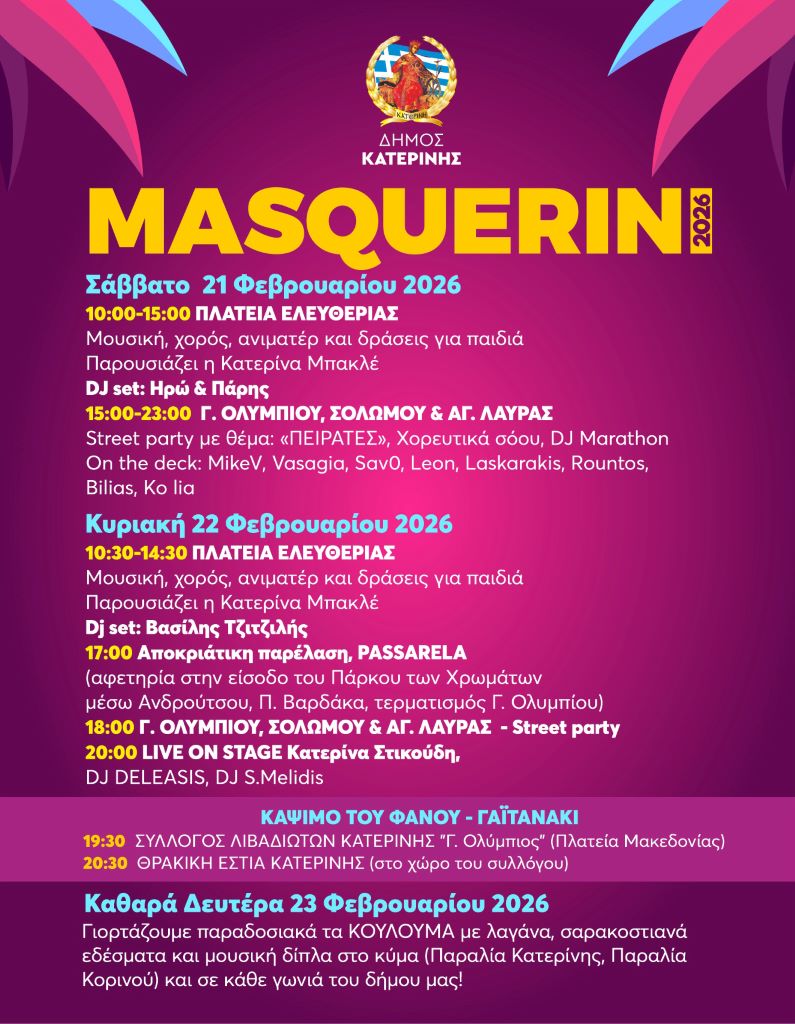Απόκριες στην Κατερίνη – Masquerini 2026/Αναλυτικό πρόγραμμα εκδηλώσεων