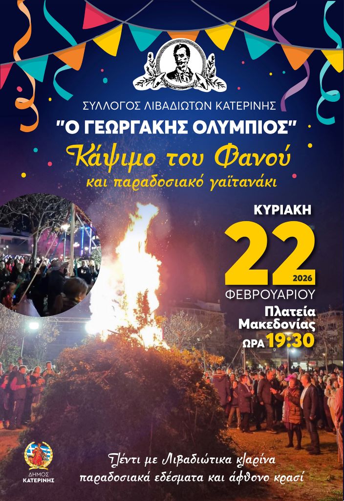 19:30  ΣΥΛΛΟΓΟΣ ΛΙΒΑΔΙΩΤΩΝ ΚΑΤΕΡΙΝΗΣ “Γ. Ολύμπιος” (Πλατεία Μακεδονίας)