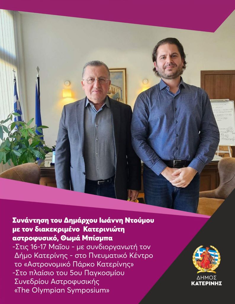 Εν όψει της διοργάνωσης του Αστρονομικού Πάρκου Κατερίνης, που θα φιλοξενηθεί στις 16-17 Μαΐου, στο Πνευματικό Κέντρο, στο πλαίσιο του 5ου Παγκοσμίου Συνεδρίου Αστροφυσικής (με συνδιοργανωτή τον Δήμο Κατερίνης), «The Olympian Symposium 2026», ο Δήμαρχος, Ιωάννης Ντούμος, υποδέχτηκε στο Δημαρχείο, τον Κατερινιώτη αστροφυσικό, Θωμά Μπίσμπα.