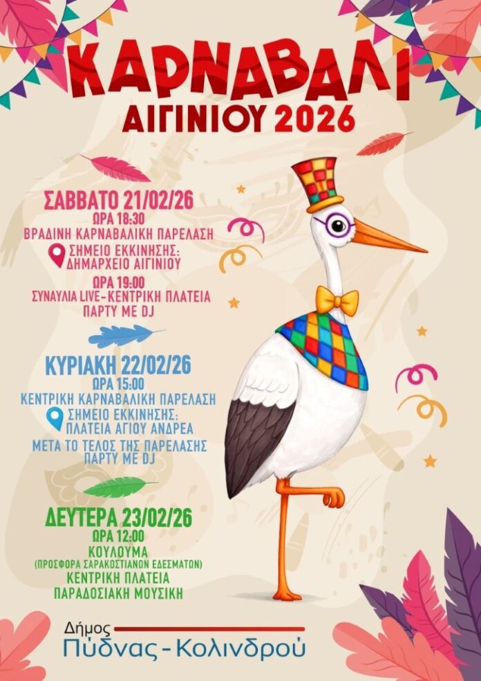 Ο Δήμαρχος Πύδνας Κολινδρού, Χρήστος Κομπατσιάρης, και η Δημοτική Αρχή σας προσκαλούμε με ιδιαίτερη χαρά στις φετινές αποκριάτικες εκδηλώσεις του Δήμου μας, που θα πραγματοποιηθούν στο Αιγίνιο, σε μια γιορτή κεφιού, δημιουργίας και παράδοσης.