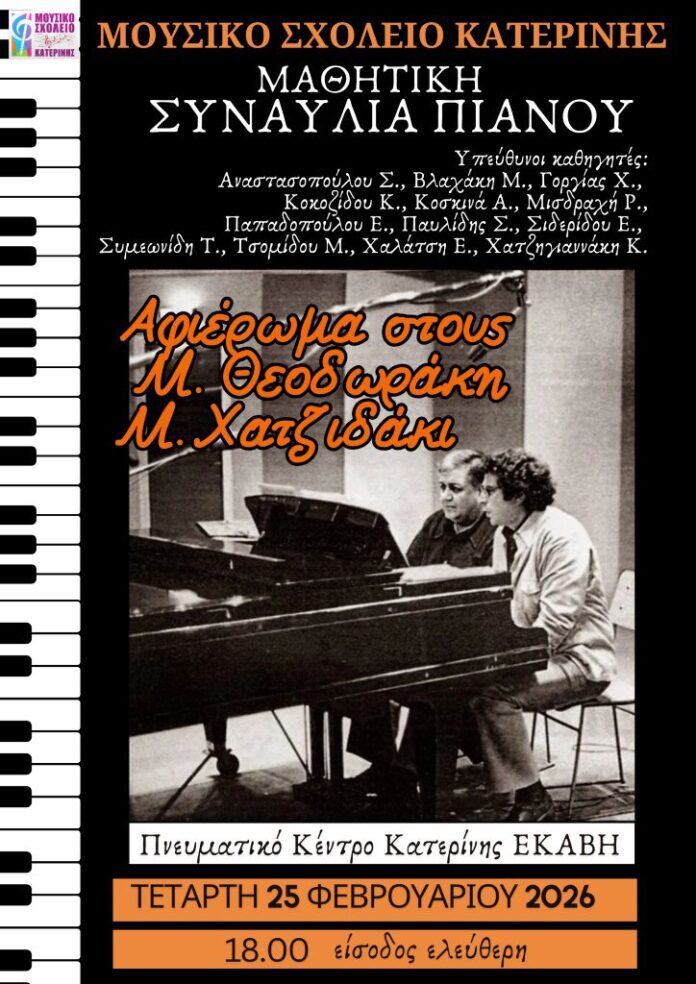 Ο τάξεις πιάνου του Μουσικού Σχολείου Κατερίνης διοργανώνουν την καθιερωμένη ετήσια συναυλία τους με αφορμή τη συμπλήρωση των 100 χρονών από τη γέννηση των δύο σπουδαίων Ελλήνων συνθετών, του Μίκη Θεοδωράκη και του Μάνου Χατζιδάκι, την Τετάρτη 25 Φεβρουαρίου 2026 και ώρα 6 το απόγευμα στο Πνευματικό Κέντρο Κατερίνης Εκάβη (ισόγειο). Η είσοδος είναι ελεύθερη.