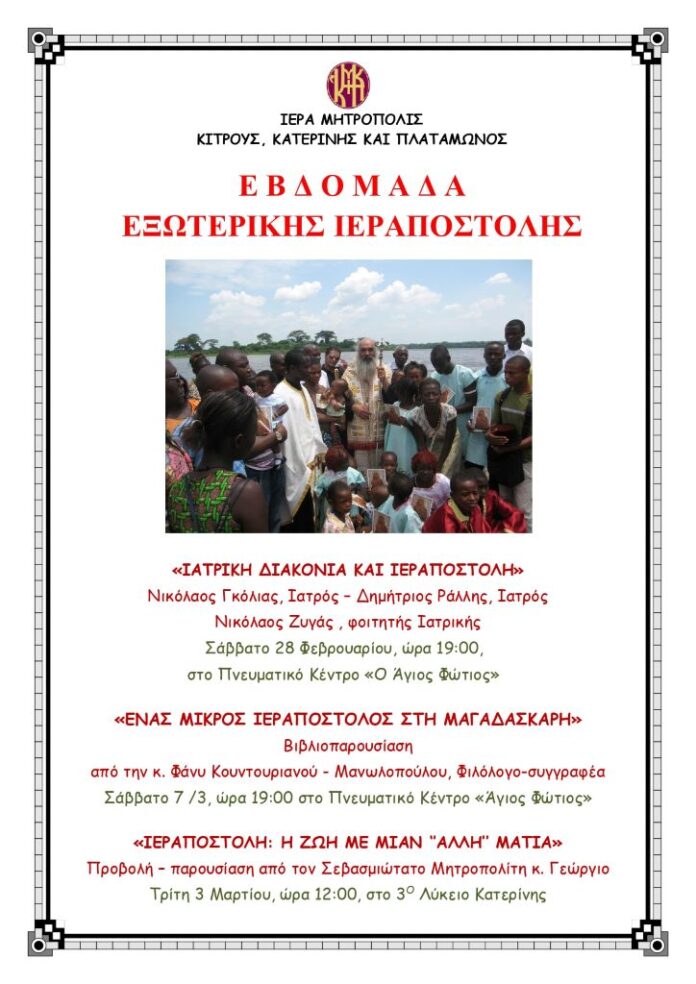 Η Ιερά Μητρόπολη Κίτρους προσκαλεί το χριστεπώνυμο πλήρωμα της Πιερίας να συμμετάσχει στις εκδηλώσεις, ώστε να ενημερωθεί, να ευαισθητοποιηθεί και να στηρίξει έμπρακτα το σπουδαίο έργο της Εξωτερικής Ιεραποστολής.