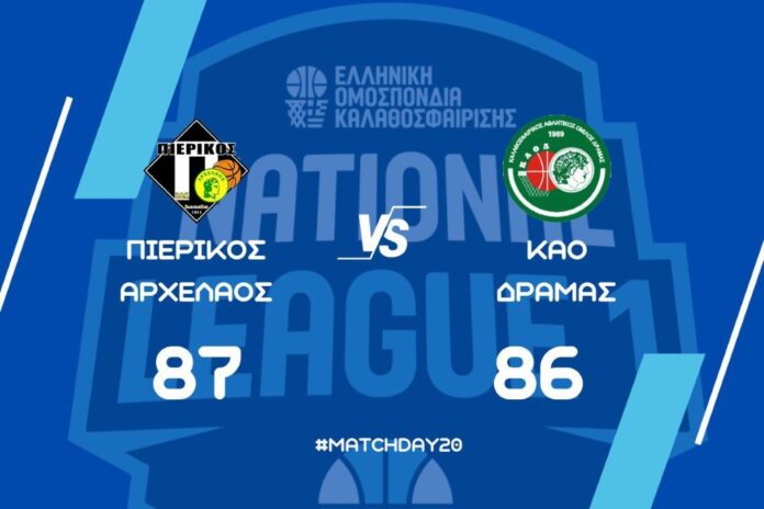Ο Πιερικός Αρχέλαος επικράτησε με 87-86 επί του ΚΑΟ Δράμας στο Κλειστό Γυμναστήριο Σιδηροδρομικού Σταθμού Κατερίνης σε αγώνα για την 20η αγωνιστική του 3ου ομίλου της NationalLeague 1.