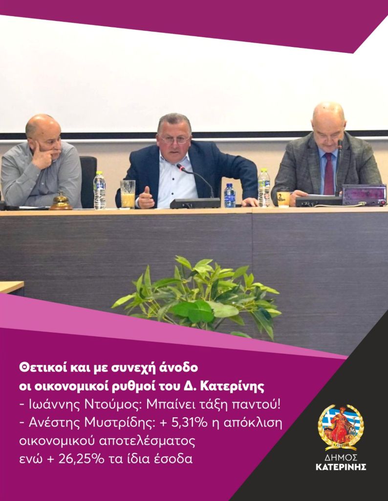 Συνεχώς θετική αποδεικνύεται η οικονομική πορεία του Δήμου Κατερίνης όπως ξεκάθαρα αποτυπώνεται στα ποσοστά που αφορούν στο κλείσιμο του 2025 (Δ’ τρίμηνο) τα οποία ανακοινώθηκαν χθες, Τετάρτη 25/2/2026, κατά τη διάρκεια συνεδρίασης του Δημοτικού Συμβουλίου.