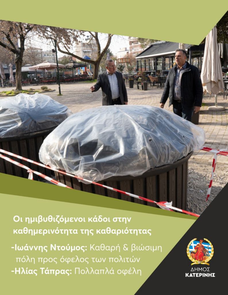 Ένα ακόμη βήμα για μία πιο καθαρή, βιώσιμη και ανθρώπινη πόλη, ένα έργο που μπορεί να αλλάξει προς το καλύτερο την καθημερινότητα στο κέντρο και στις γειτονιές της Κατερίνης, είναι γεγονός. Ο λόγος για την προμήθεια και τοποθέτηση από τον Δήμο Κατερίνης/Αντιδημαρχία Καθαριότητας οκτώ (08) ημιβυθιζόμενων κάδων απορριμμάτων μεγάλης χωρητικότητας (3.000 λίτρων), με ειδικούς σάκους και σακούλες μιας χρήσεως, στους οποίους θα συσσωρεύονται οικιακά απορρίμματα.