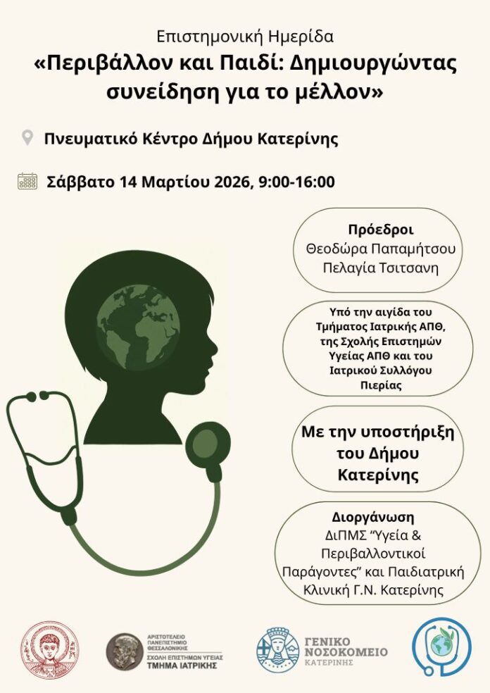 Το Διιδρυματικό Πρόγραμμα Μεταπτυχιακών Σπουδών «Υγεία & Περιβαλλοντικοί Παράγοντες» και η Παιδιατρική Κλινική του ΓΝ Κατερίνης, διοργανώνουν επιστημονική ημερίδα με τίτλο «Περιβάλλον και Παιδί: Δημιουργώντας συνείδηση για το μέλλον».