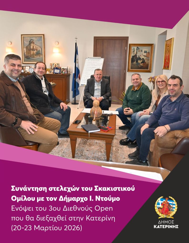 Ενόψει του «3ου Διεθνούς Open Κατερίνης» που θα διεξαχθεί το τετραήμερο 20-23 Μαρτίου 2026 στην Κατερίνη, πραγματοποιήθηκε συνάντηση μεταξύ του Δημάρχου, Ιωάννη Ντούμου, και μελών του Διοικητικού Συμβουλίου του Σκακιστικού Ομίλου Κατερίνης, παρουσία και της Αντιδημάρχου Πολιτισμού & Τουρισμού, Ελίνας Διαμαντοπούλου.