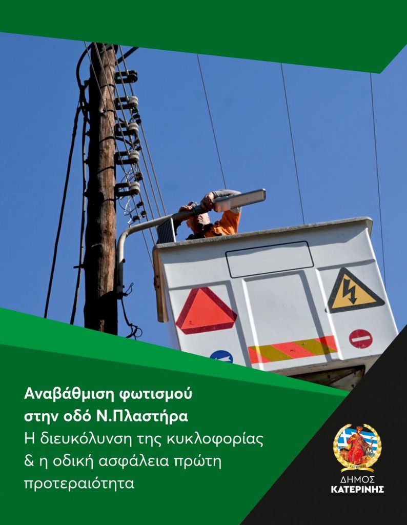 Στην αντικατάσταση των εξήντα (60) συνολικά υφιστάμενων ενεργοβόρων φωτιστικών σωμάτων συμβατικής τεχνολογίας του δημοτικού φωτισμού, στην οδό Ν.Πλαστήρα (Εγγλέζικος – από το ύψος του κυκλικού κόμβου έως τη Διεύθυνση Αστυνομίας Πιερίας), με νέα φωτιστικά σώματα σύγχρονης τεχνολογίας τύπου LED, προχωρά ο Δήμος Κατερίνης. Οι εργασίες ξεκίνησαν σήμερα, από συνεργείο της Αντιδημαρχίας Πρασίνου & Ηλεκτροφωτισμού, παρουσία και του αντιδημάρχου Κώστα Τσιουκάνη.