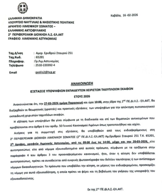 Διενέργεια εξετάσεων υποψήφιων εκπαιδευτών χειριστών ταχύπλοων σκαφών