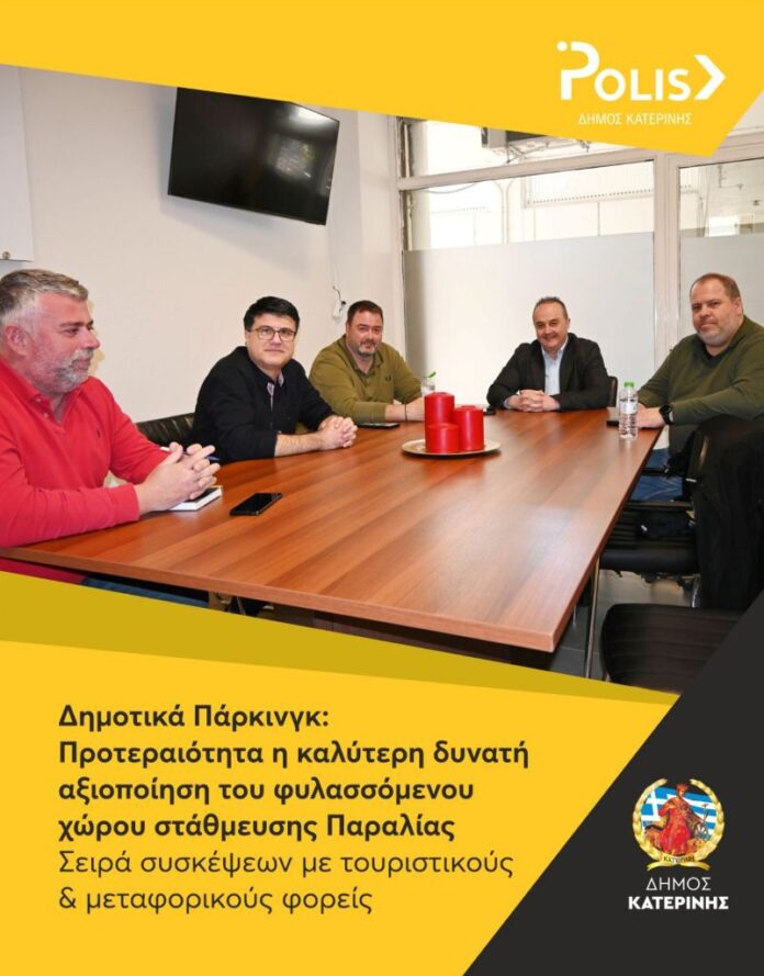 Τις προτάσεις τους, ενόψει της φετινής τουριστικής περιόδου, για τη στήριξη και την καλύτερη δυνατή αξιοποίηση του φυλασσόμενου Δημοτικού Πάρκινγκ στην Παραλία Δ. Κατερίνης, κατέθεσαν κατά τη διάρκεια σειράς συσκέψεων που πραγματοποιήθηκαν με πρωτοβουλία της Διοίκησης των Δημοτικών Πάρκινγκ (Polis A.E.) Κατερίνης.