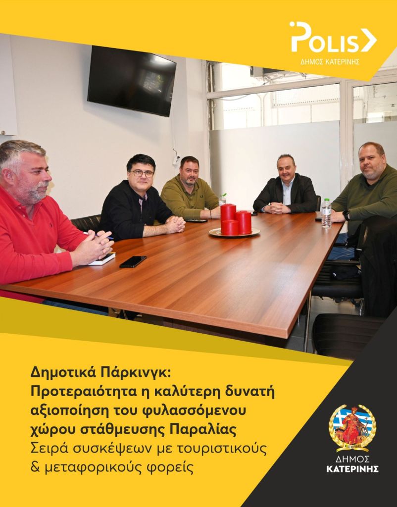 Συγκεκριμένα, η Διοίκηση των Πάρκινγκ Δ. Κατερίνης με επικεφαλής τον Πρόεδρο, Γιώργο Μπαλαούρα, συναντήθηκε, αρχικά, με ξενοδόχους της Παραλίας, με τη συμμετοχή του Προέδρου της Δημοτικής Κοινότητας, Αλέξη Τσαουσίδη, του Προέδρου της Ένωσης Ξενοδόχων Πιερίας, Ηρακλή Τσιτλακίδη, καθώς και του Προέδρου του Συλλόγου Ελευθέρων Επαγγελματιών Παραλίας, Τέλη Καραθανάση.