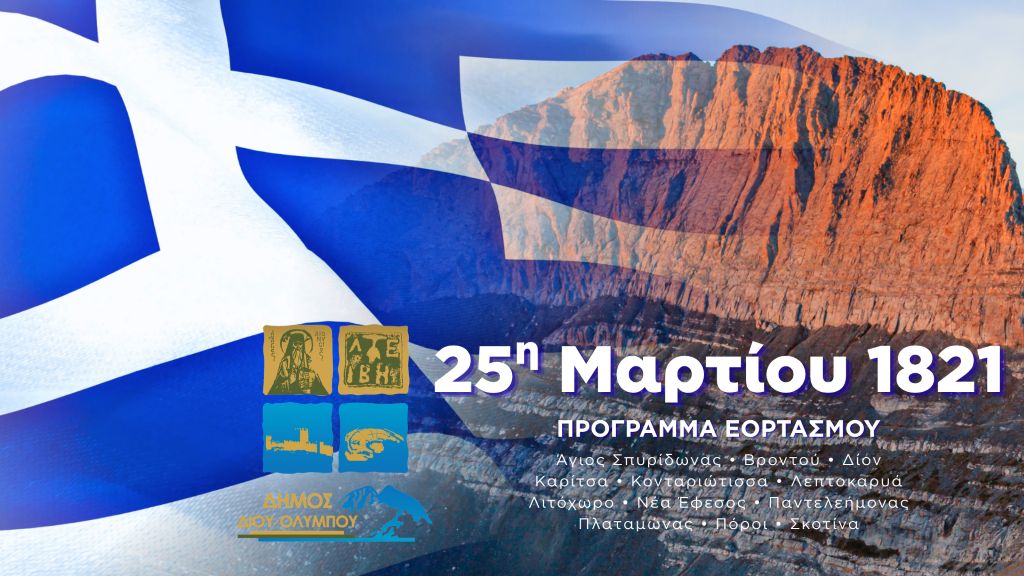 Γενικός Σημαιοστολισμός – φωταγώγησηΑπό την 8η πρωινή της 23ης και μέχρι τη δύση του ηλίου της 25ης Μαρτίου 2026, θα σημαιοστολιστούν όλα τα δημόσια και δημοτικά καταστήματα, οι δρόμοι και οι πλατείες των Δημοτικών Κοινοτήτων του Δήμου Δίου-Ολύμπου.