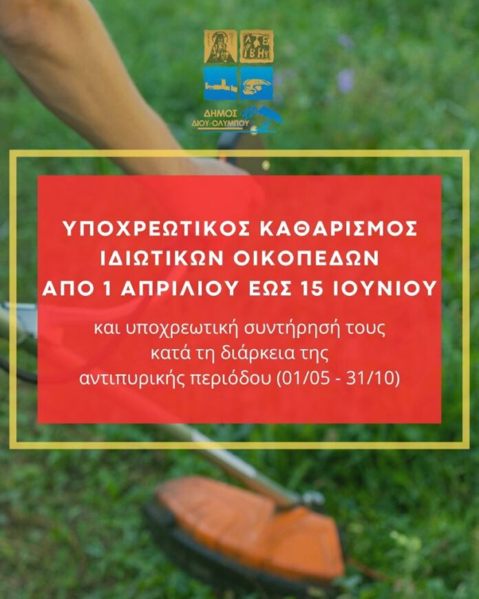 O Δήμος Δίου-Ολύμπου υπενθυμίζει και καλεί τους ιδιοκτήτες, νομείς, επικαρπωτές, μισθωτές και υπομισθωτές να μεριμνήσουν από την 1η Απριλίου 2026 έως τις 15 Ιουνίου 2026 για την εκπλήρωση της υποχρέωσης καθαρισμού, καθώς και για τη συντήρηση έως το τέλος της αντιπυρικής περιόδου (31 Οκτωβρίου 2026), προς αποτροπή κινδύνου πρόκλησης πυρκαγιάς ή ταχείας επέκτασής της, των οικοπεδικών και λοιπών ακάλυπτών χώρων που βρίσκονται σε: