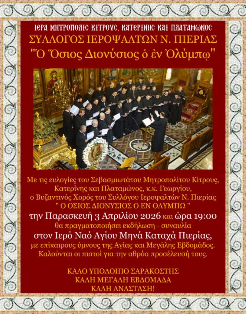 Με τις ευλογίες του Σεβασμιωτάτου Μητροπολίτου Κίτρους, Κατερίνης και Πλαταμώνος κ.κ. Γεωργίου, ο Βυζαντινός Χορός του Συλλόγου Ιεροψαλτών Ν. Πιερίας «Ο ΟΣΙΟΣ ΔΙΟΝΥΣΙΟΣ Ο ΕΝ ΟΛΥΜΠΩ» την Παρασκευή 03 Απριλίου 2026 και ώρα 19:00, θα πραγματοποιήσει εκδήλωση – συναυλία στον Ιερό Ναό Αγίου Μηνά Καταχά – Πιερίας, με επίκαιρους ύμνους της Αγίας και Μεγάλης Εβδομάδος.