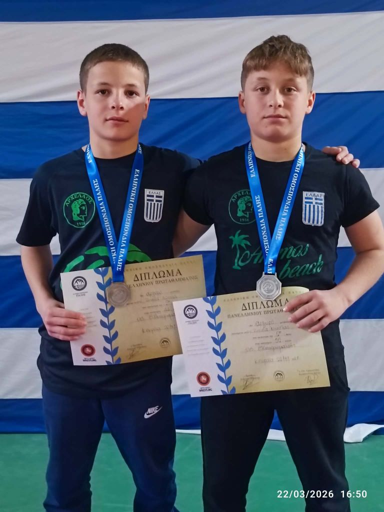 Με δύο λαμπρά ασημένια μετάλλια επέστρεψε το Τμήμα Πάλης του Αρχέλαου Κατερίνης από το Πανελλήνιο Πρωτάθλημα Πάλης Παμπαίδων U15, που διεξήχθη στις 22 Μαρτίου 2026 στα Πορόια Σερρών.
